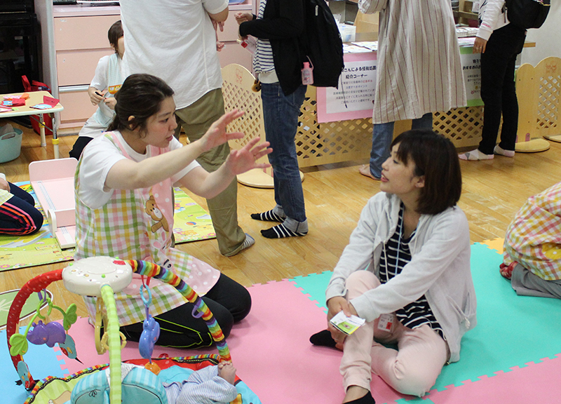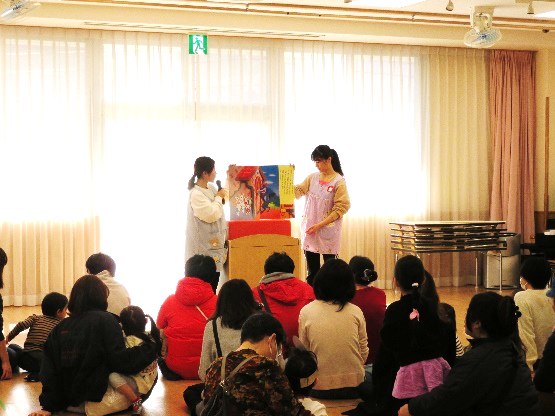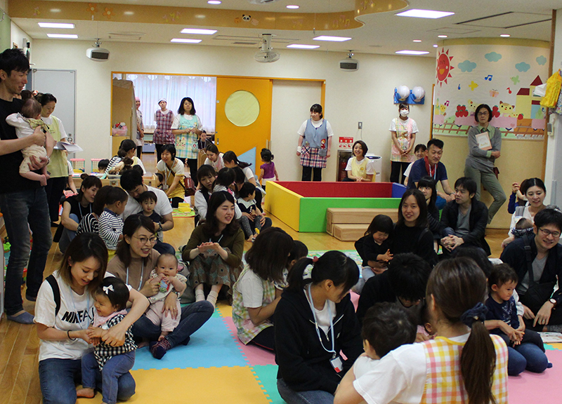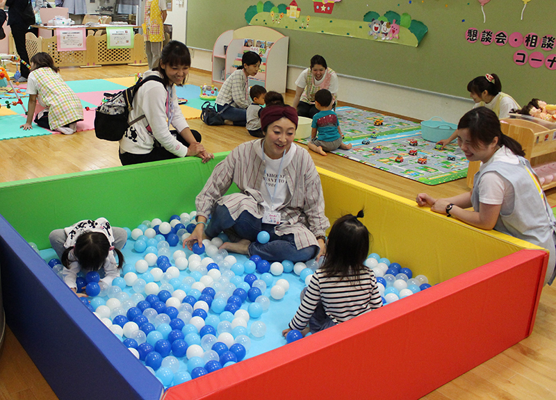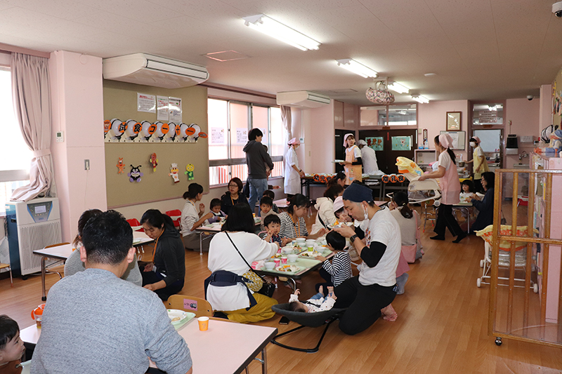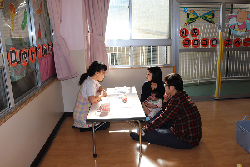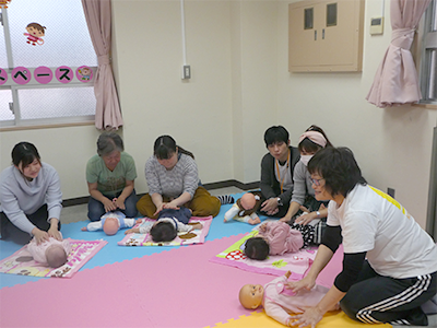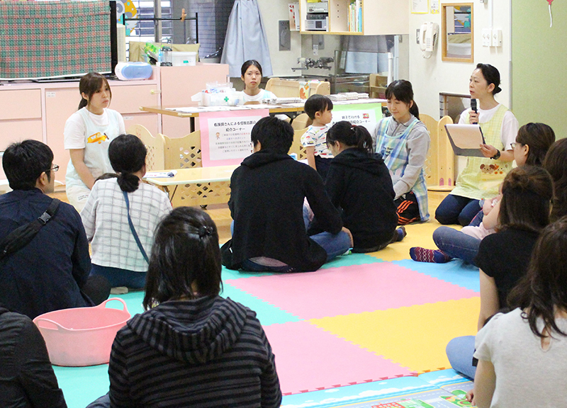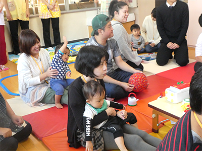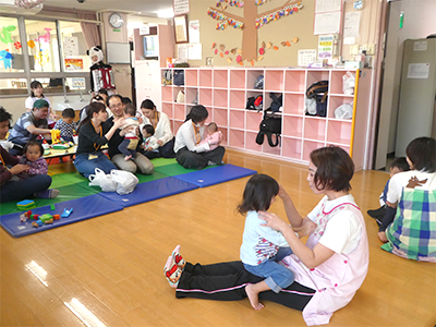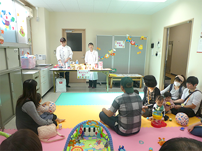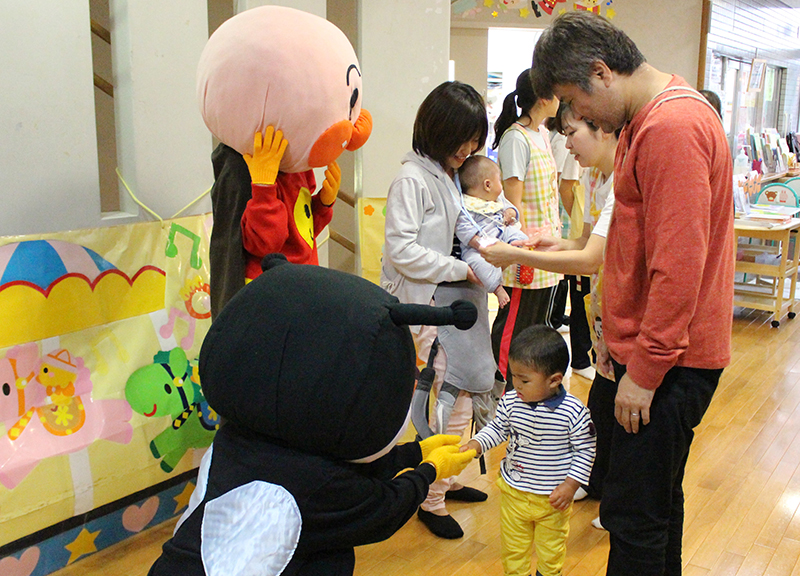 親子でボールプールやおままごと等、保育園で人気の玩具で遊んだり、保育士との懇談やふれあい遊びを行ったりと、楽しいひとときとなりました。 離乳食、幼児食の試食会や看護師による家庭で起こりうる怪我の処置の実演を行い、真剣な表情で傾聴されていました。アンパンマン、バイキンマンとの記念撮影は、参加者の皆様にとても喜んで頂けました。
