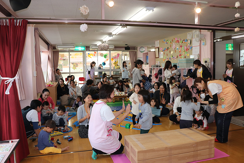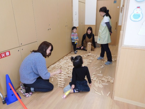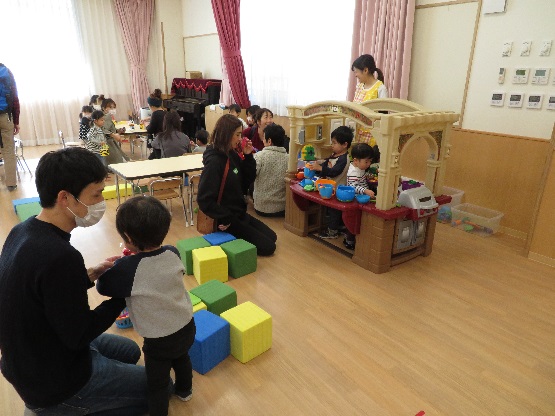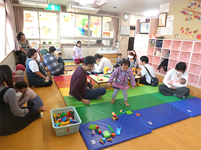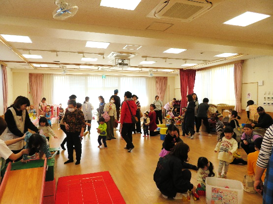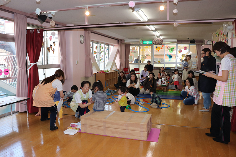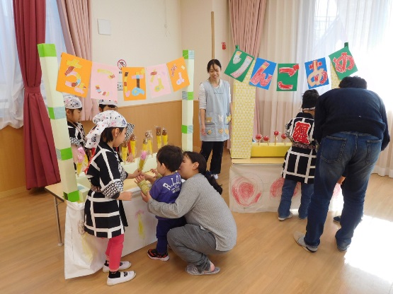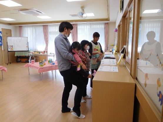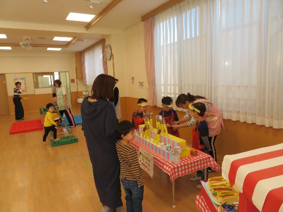 在園児によるお店屋さんごっこで品物を受け取り、とても喜んでいただけました。製作コーナーや作品展示も好評で、幼児の保育園ならではの活動を知って頂けたのではないかと思います。玩具で夢中になって遊んだり、屋上や図書コーナーでのんびり過ごしたりと、楽しいひとときとなったようです。