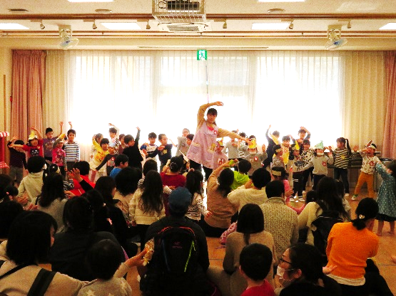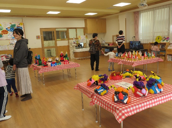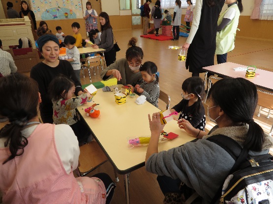 在園児によるお店屋さんごっこでは、やりとりを恥ずかしそうにしながらも品物を受け取り、嬉しそうに持ち帰る姿が見られました。作品展示では各クラスの作品を見て頂くことで年齢ごとの発達段階を感じてもらいながら保育園での活動内容を知ってもらえたと思います。体操で使用するお面を製作コーナーで作る事により、在園児との体操コーナーでは一体感を持って楽しむことが出来ました。他にも大型スクリーンを用いての保育園の日常の様子を上映、保育士による手遊び紹介・大型絵本読み聞かせ等保育園ならではの楽しいひと時を過ごせて頂けたと思います。