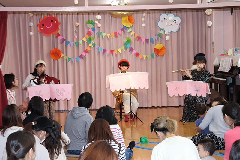サックス、フルート、アコーディオン、ピアノによる赤ちゃんコンサートはたくさんの 人に観て聞いて頂きました。給食試食会場は、待ち時間が出る程の大行列でした。今回初めて設けた歯科衛生士の口内ケアコーナーでは、乳歯の模型を用いての相談が好評でした。ふれあい遊びも親子いっしょに楽しむ姿が見られました。天気も良かったので、あおぞら広場でも気持ち良さそうに遊んでいました。看護師による応急処置実演では、看護師が迫真の演技で見ていた参加者を釘付けにしていました。