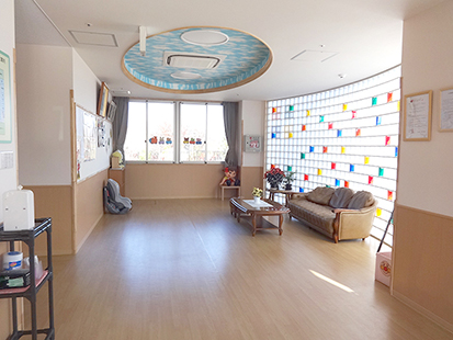 当園自慢のエントランスホールです。後ろのガラスが色鮮やかで、きれいですよ。