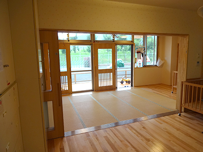 幼児さんのお部屋です。現在4つの部屋に分かれています。天気の良い日はお散歩に出掛けたりもしています。